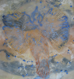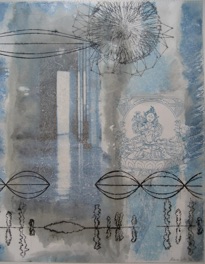 Since 1998, she has studied etching at the Manhattan Graphics Center, in New York City and wishes to acknowledge her teacher there, Vijay Kumar. The layers of texture and color in the etchings achieved through a process called Viscosity Printing resonate also in the Encaustic works where the wax medium allows for a layered effect. Lynn utilizes etched images on transparent rice paper in the encaustic layers, so there is a crossover of mediums to achieve the imagery.